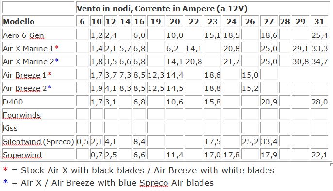 Qui sotto riporto per comodità una tabella riassuntiva in cui vengono riportati gli Ampere prodotti dai vari modelli in funzione del vento.